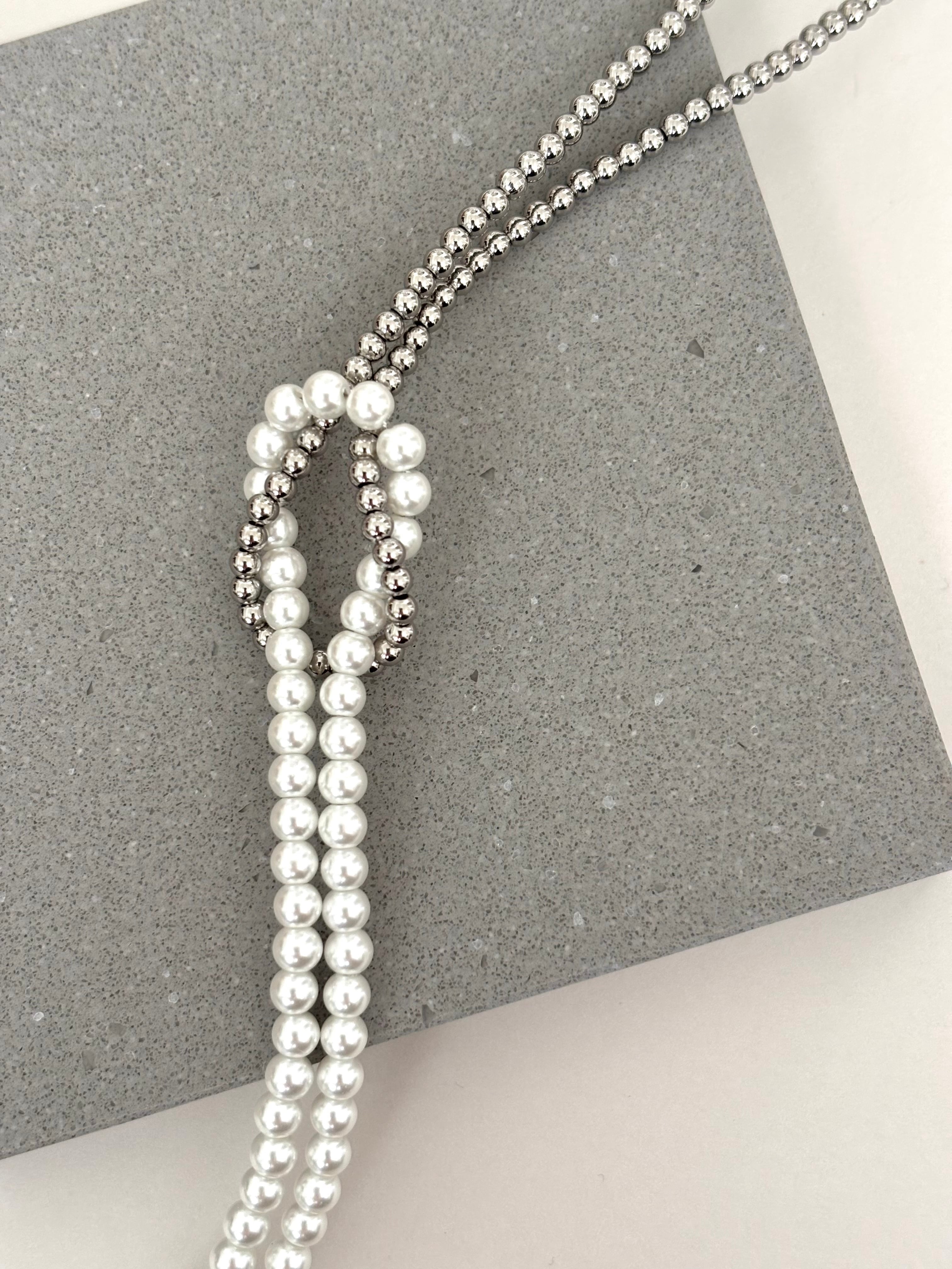 パールとシルバーメタルの2連デザインネックレス。
