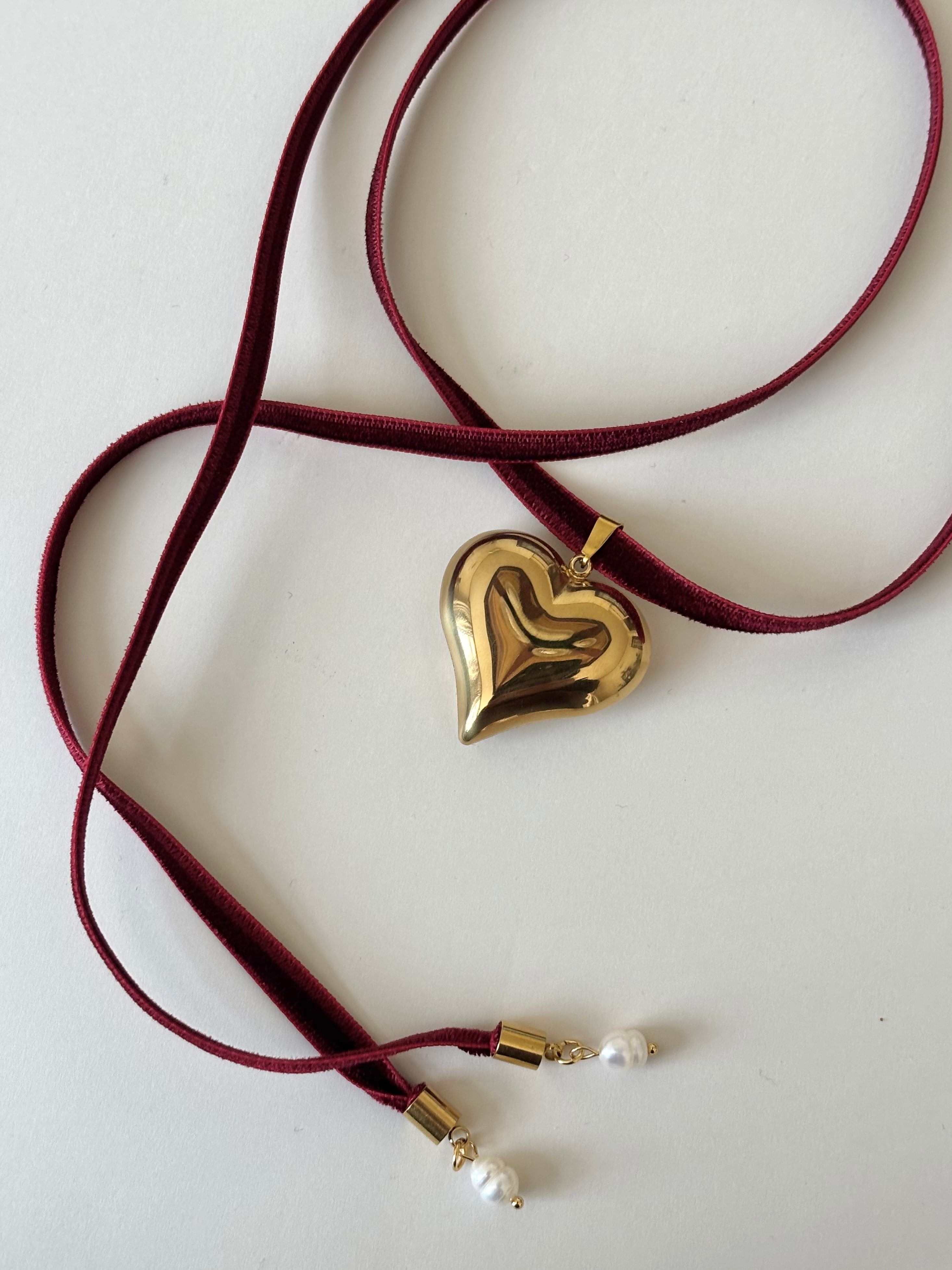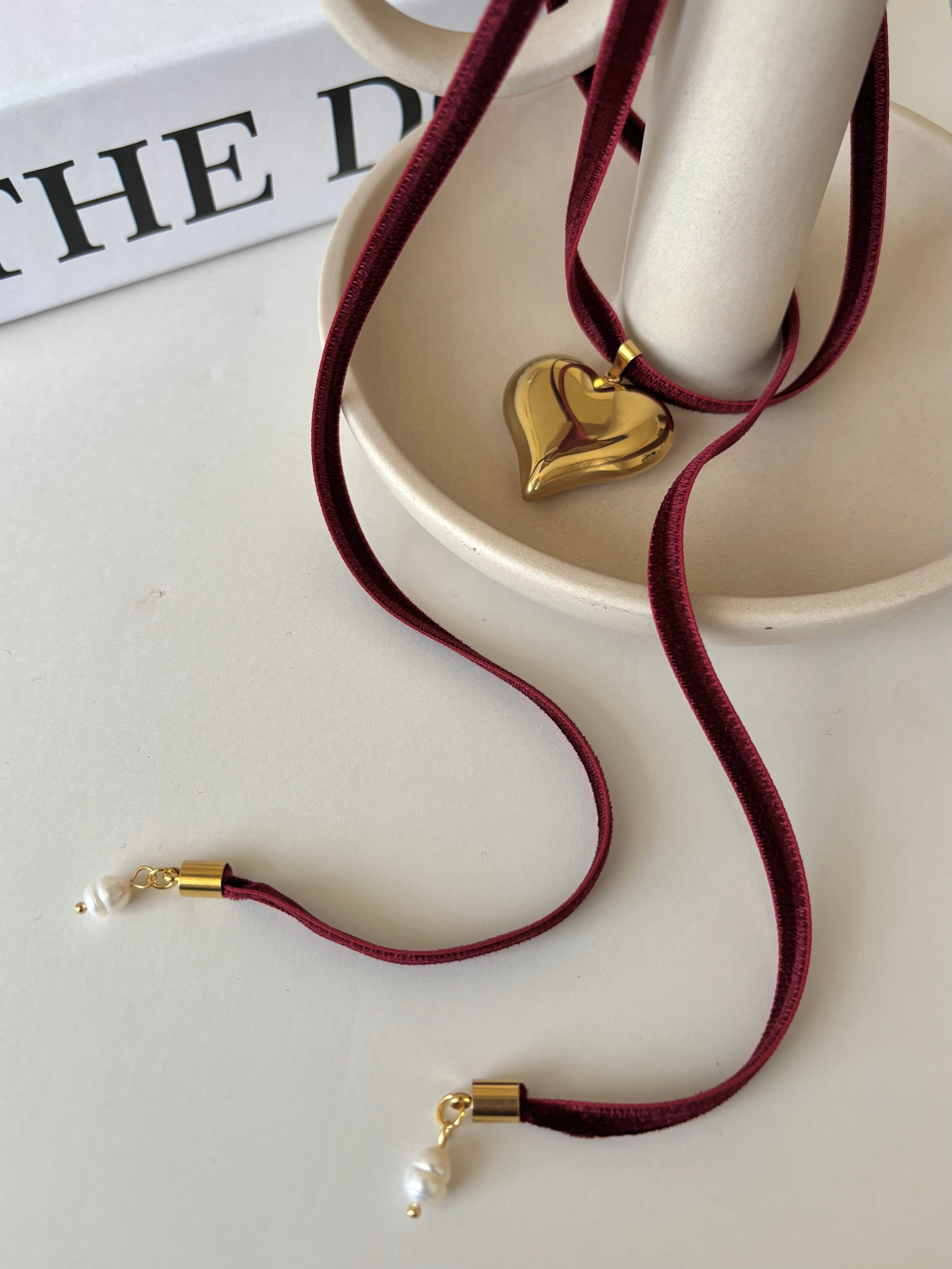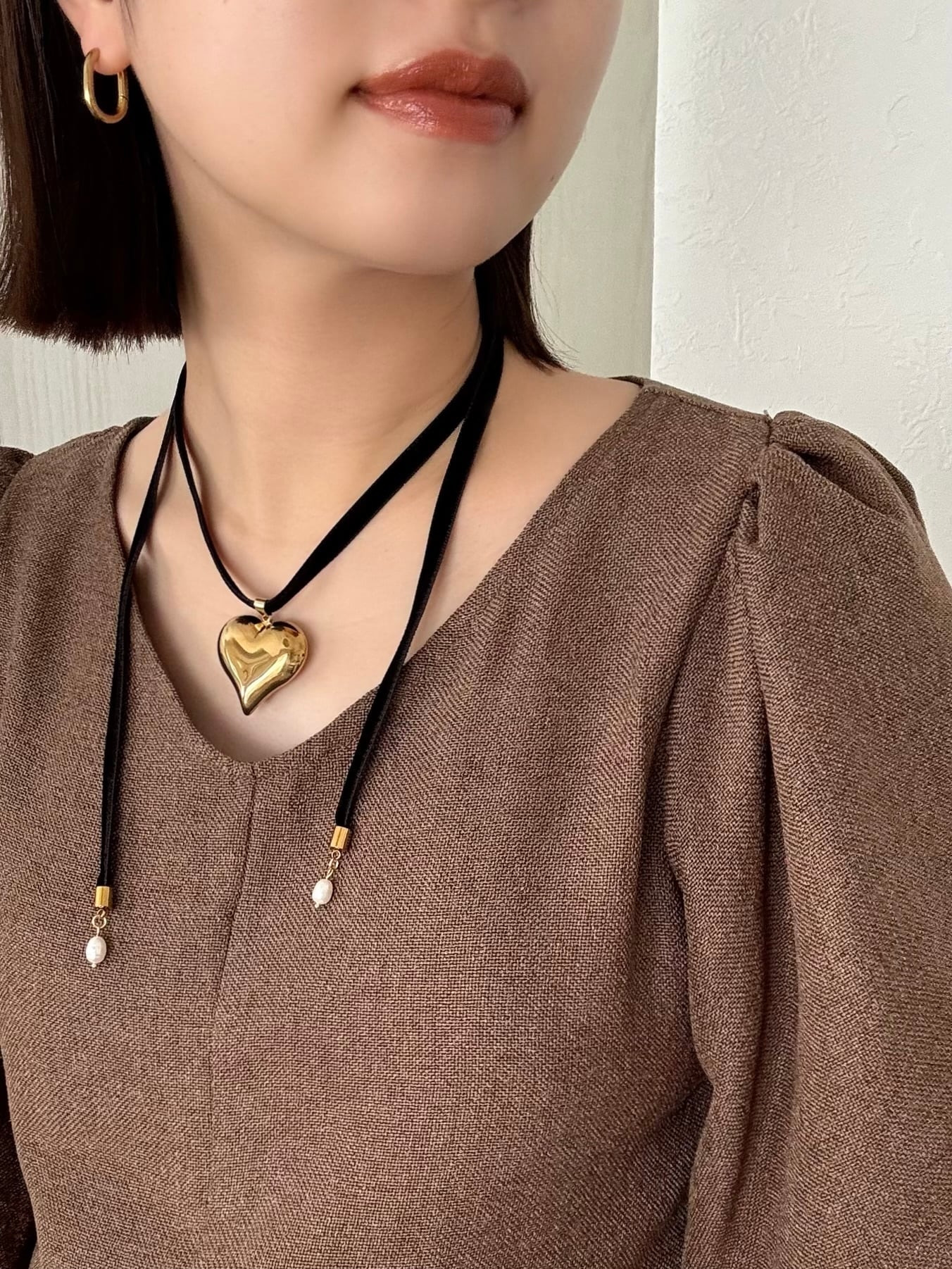 存在感のあるぷっくりとしたハートペンダントとクラシカルさも感じられるパールの組み合わせで、誰もが心くすぐられる大人チョーカーに。