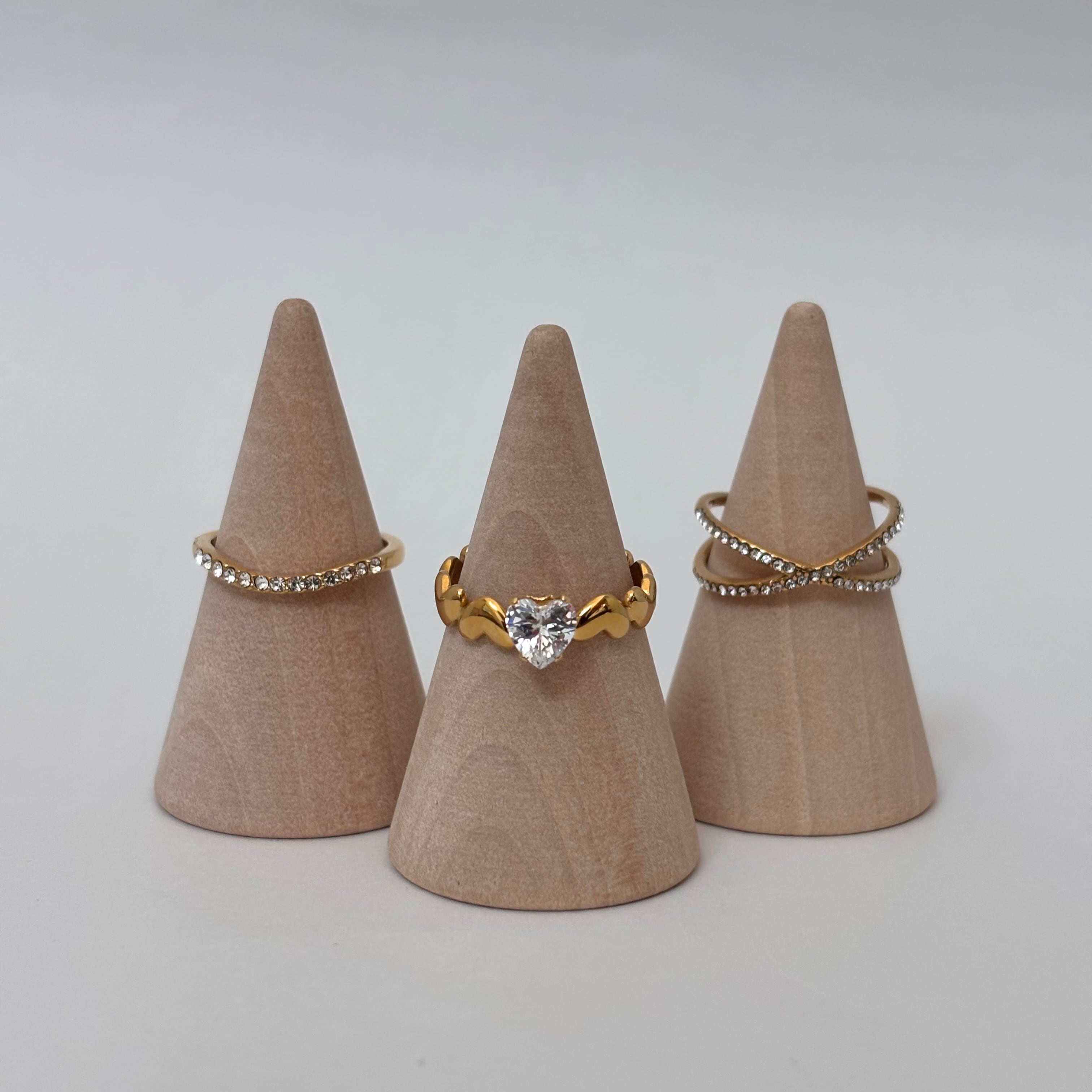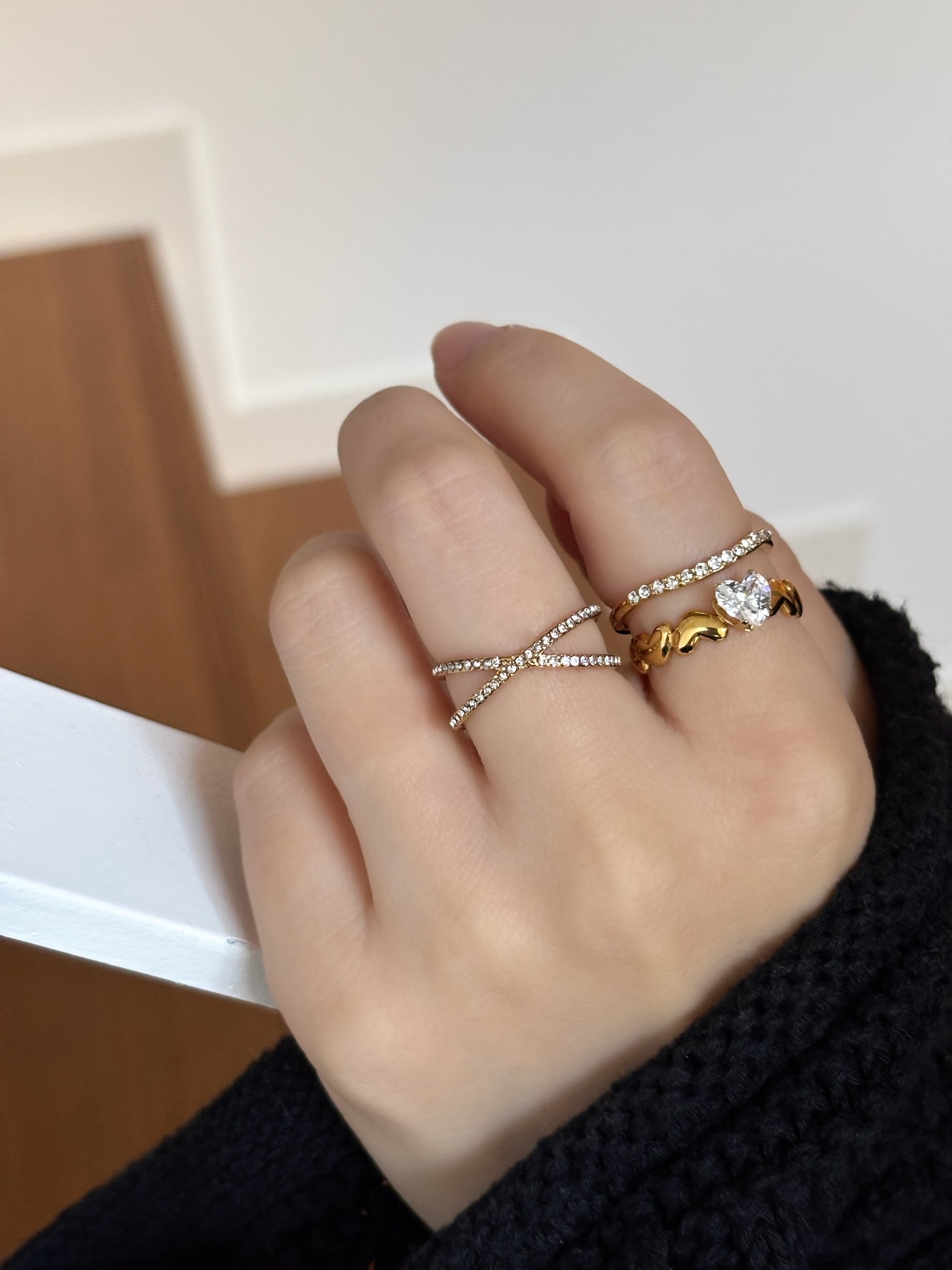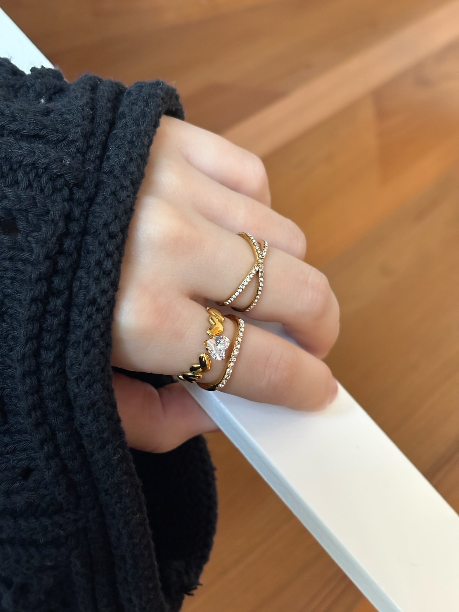 華奢なストーンリング、立体感のあるハートリング、クロスラインのデザインリングの3点セット。