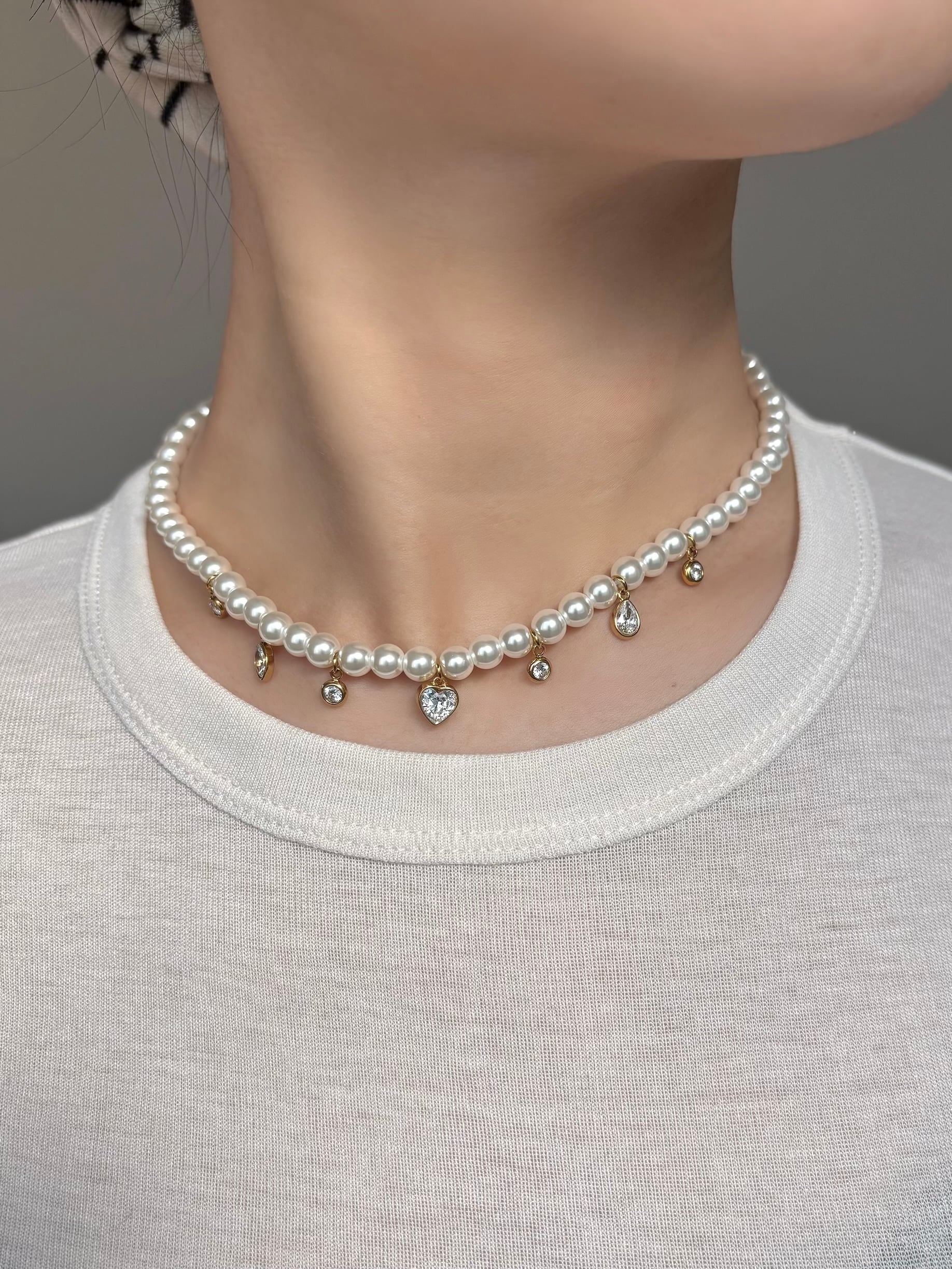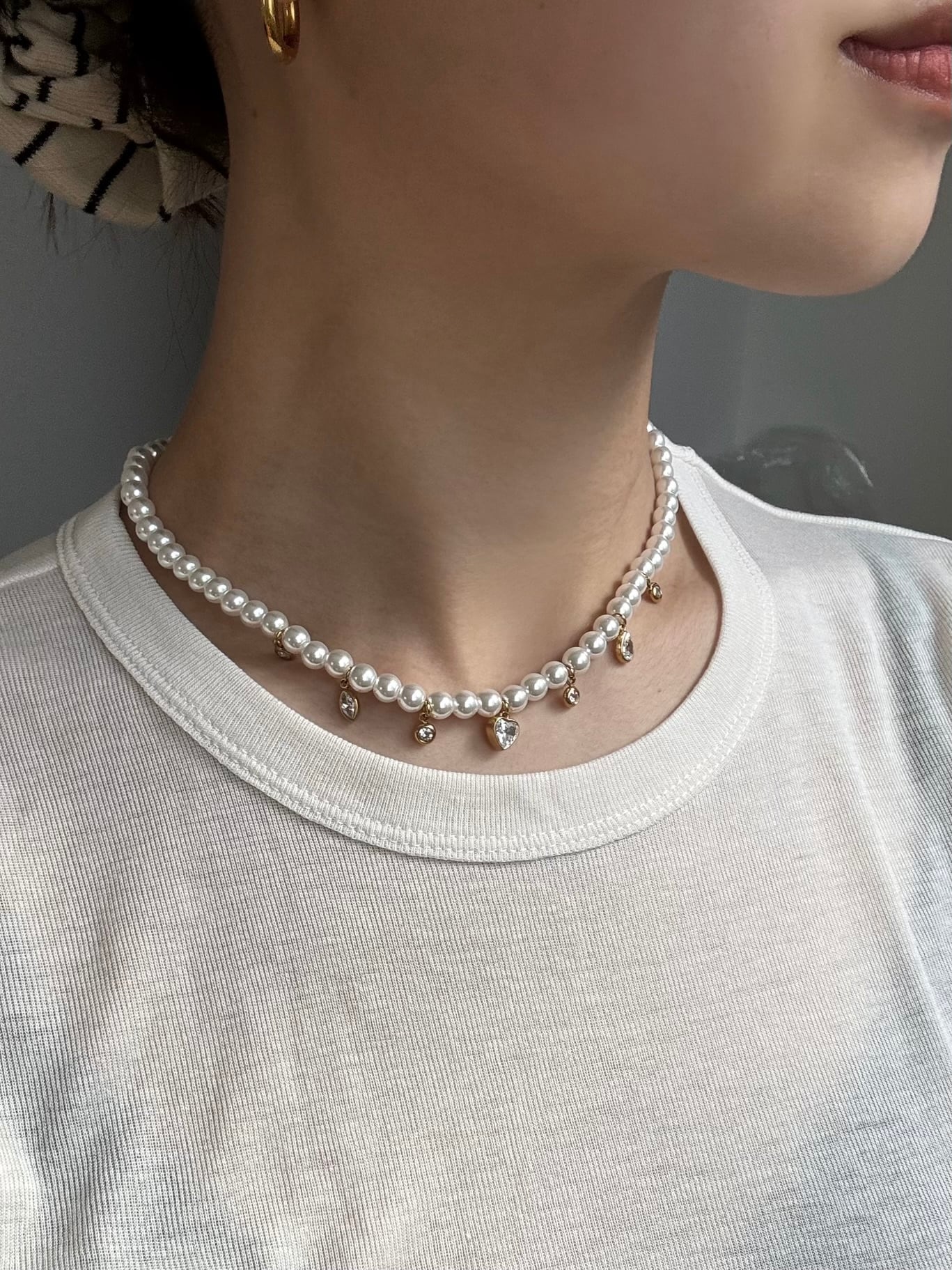 クラシカルなパールに小さなビジューチャームがポイントになったネックレス。