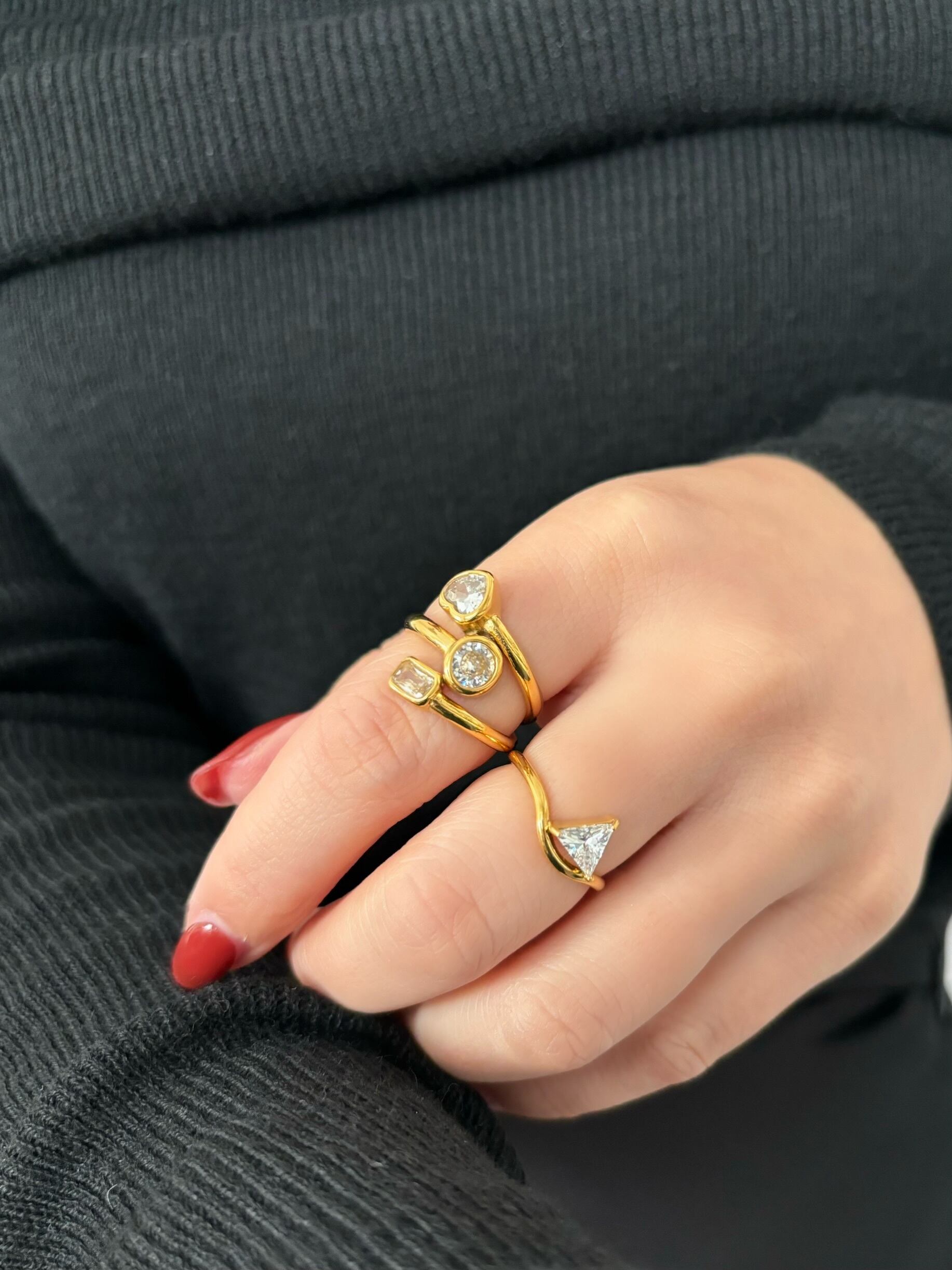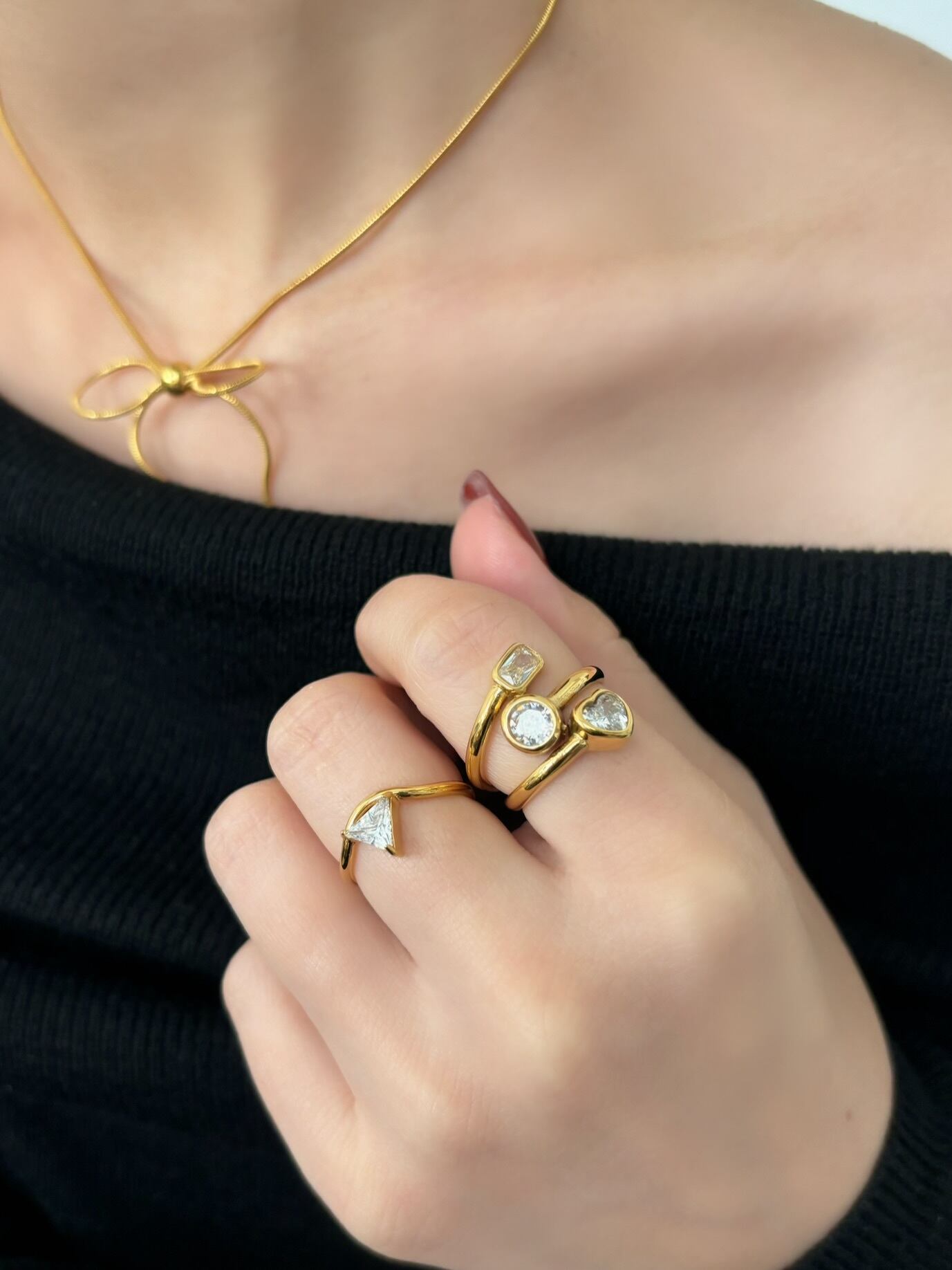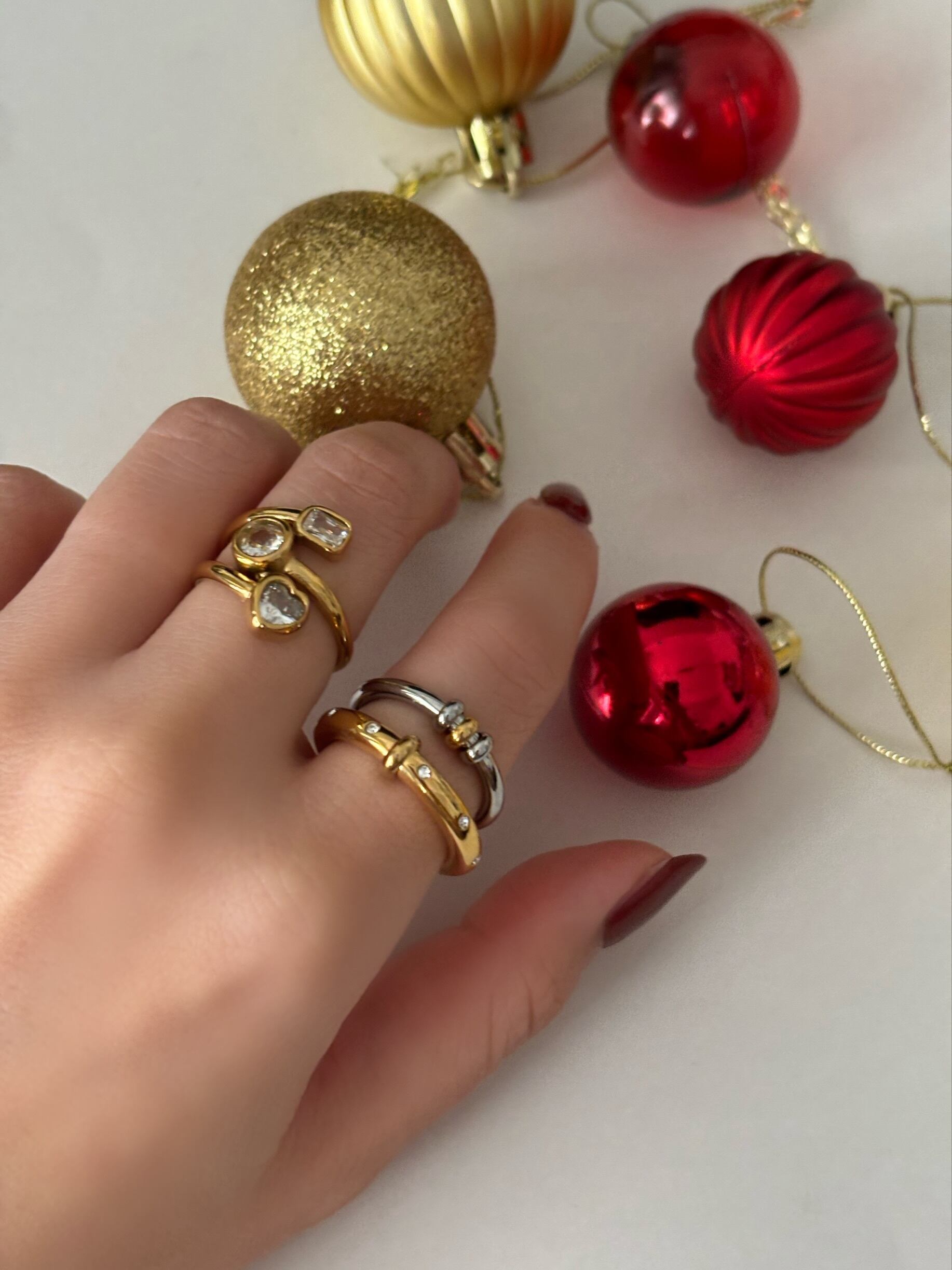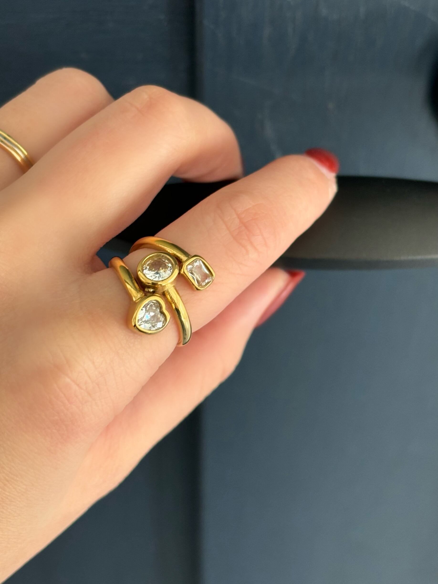 スクエア、サークル、ハートのジルコニアストーンが連なったリングです。