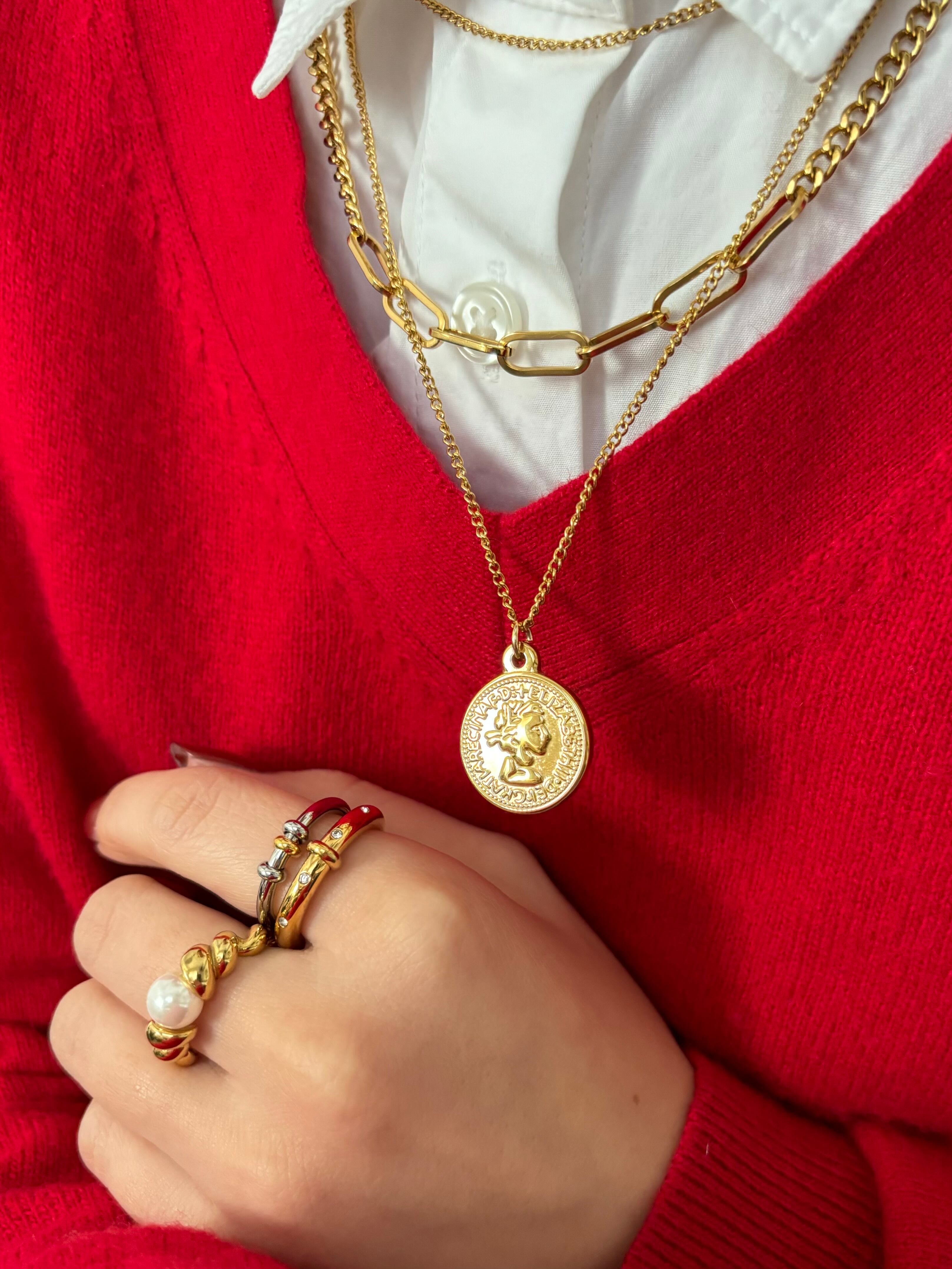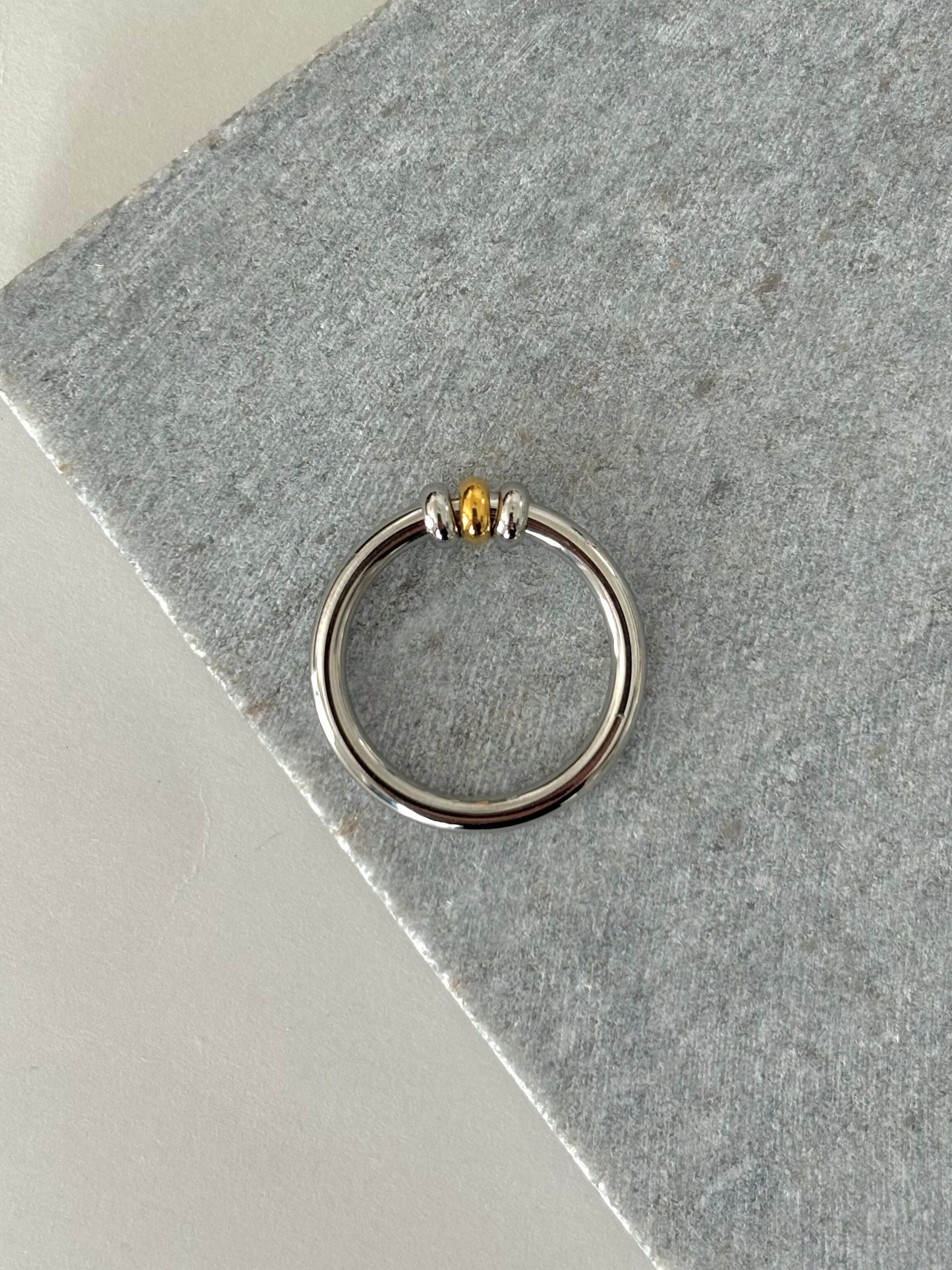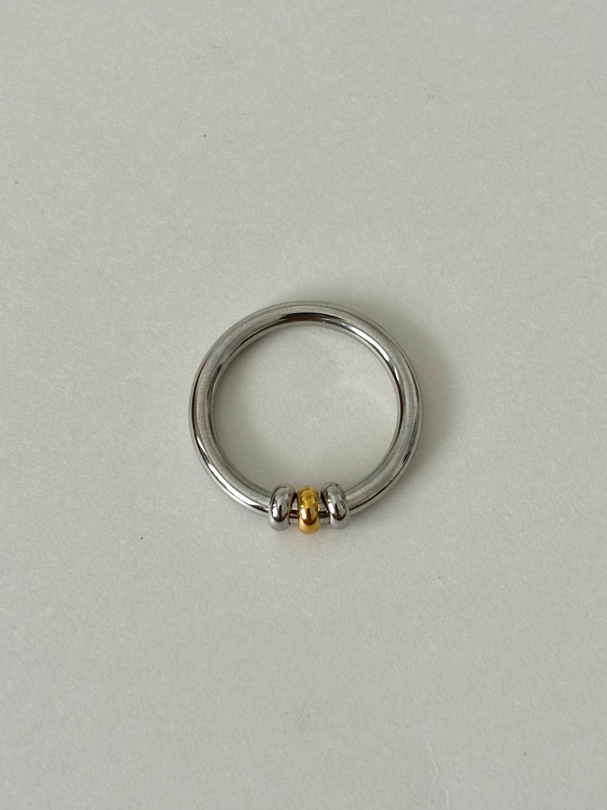 シンプルで重ね付けもしやすいゴールドとシルバーのミックスリング。