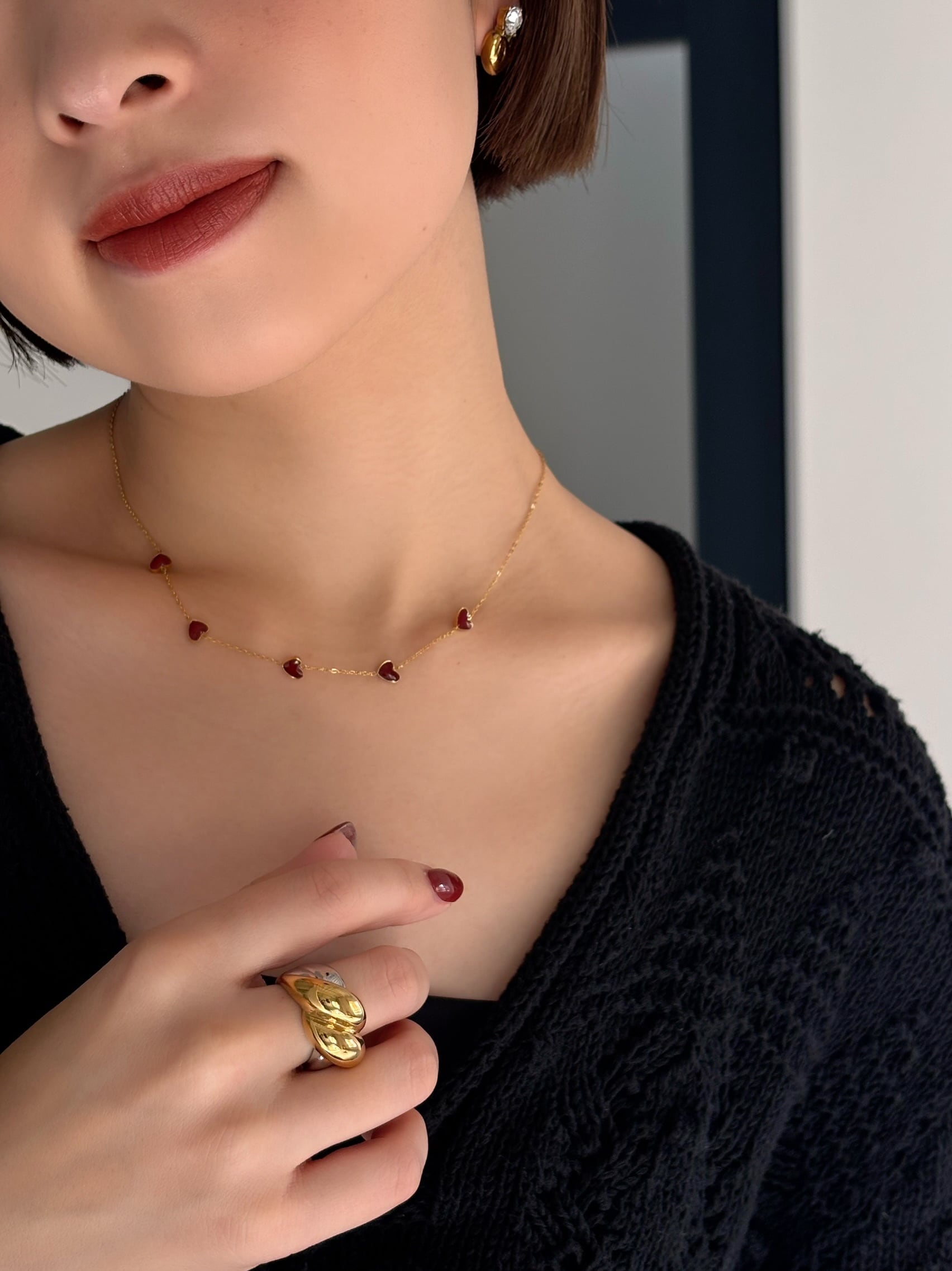 深みのあるボルドーのハートチャームと華奢なチェーンが煌めくネックレスです。
